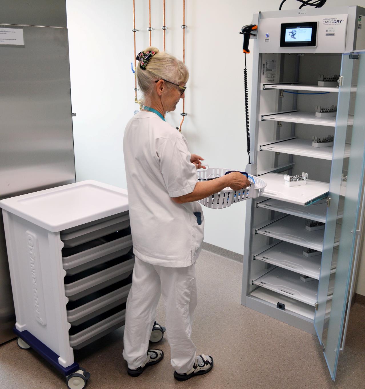 Personalet kan ta endoskopene ut av vaskemaskinen og flytte dem direkte over i tørkeskapet uten å måtte håndtere endoskopene direkte.