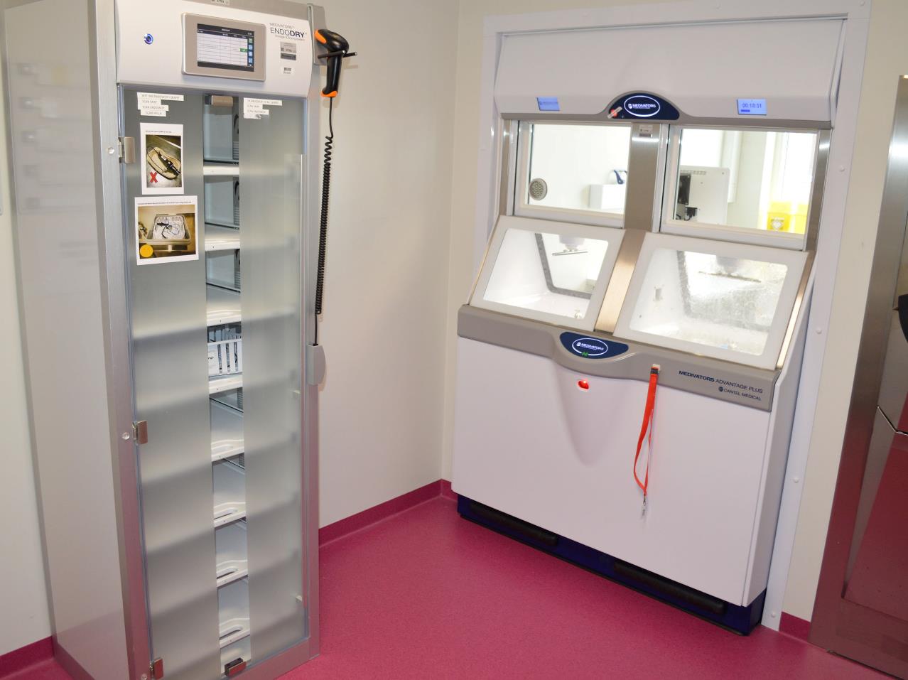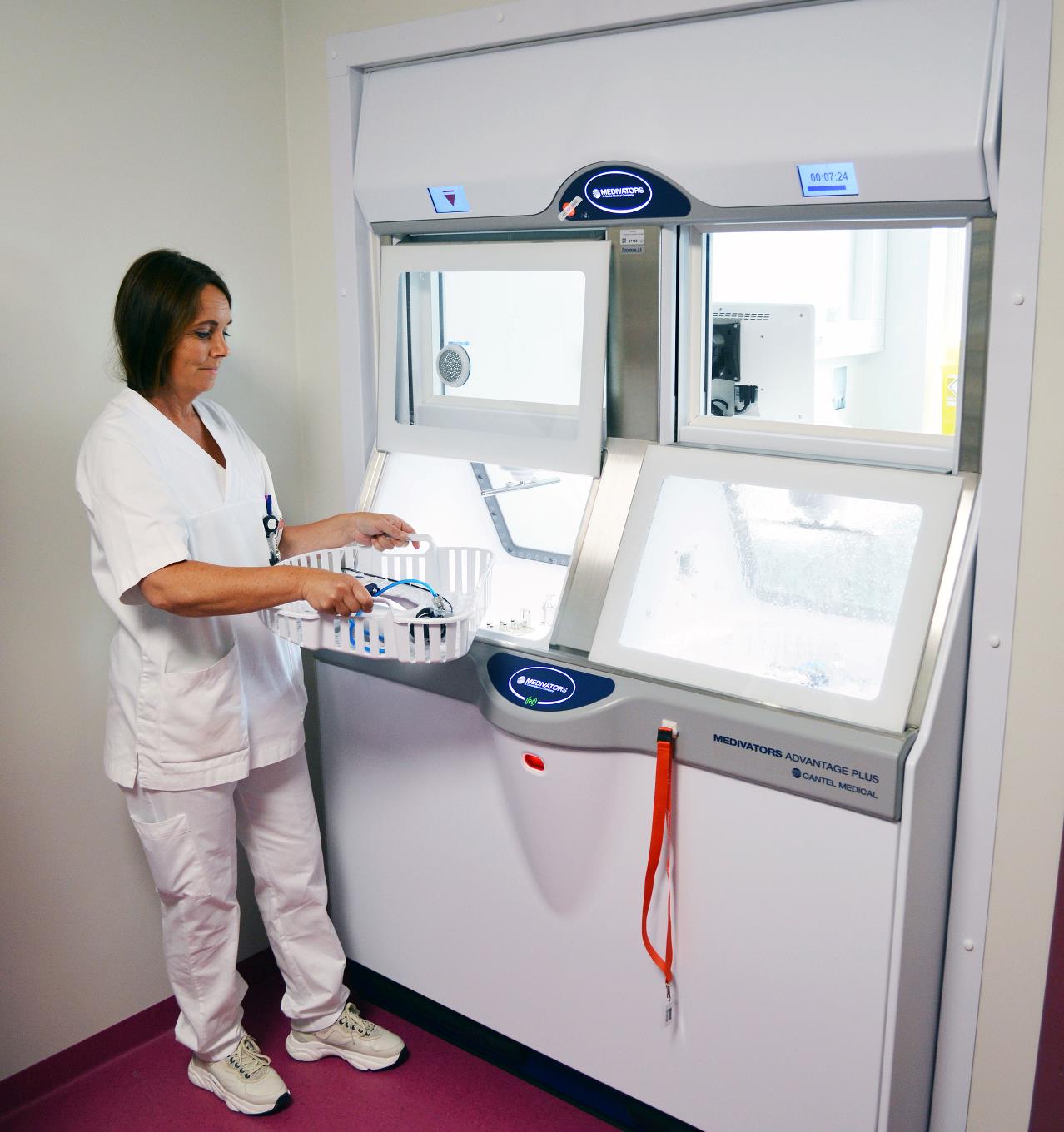 De nye vaskemaskinene heter Advantage Plus Pass-Thru, og hver maskin kan vaske opp til fire endoskop i timen. Det gir en total vaskekapasitet på 12 skop i timen. For mindre skop kan man komme helt opp i 24 skop i timen.