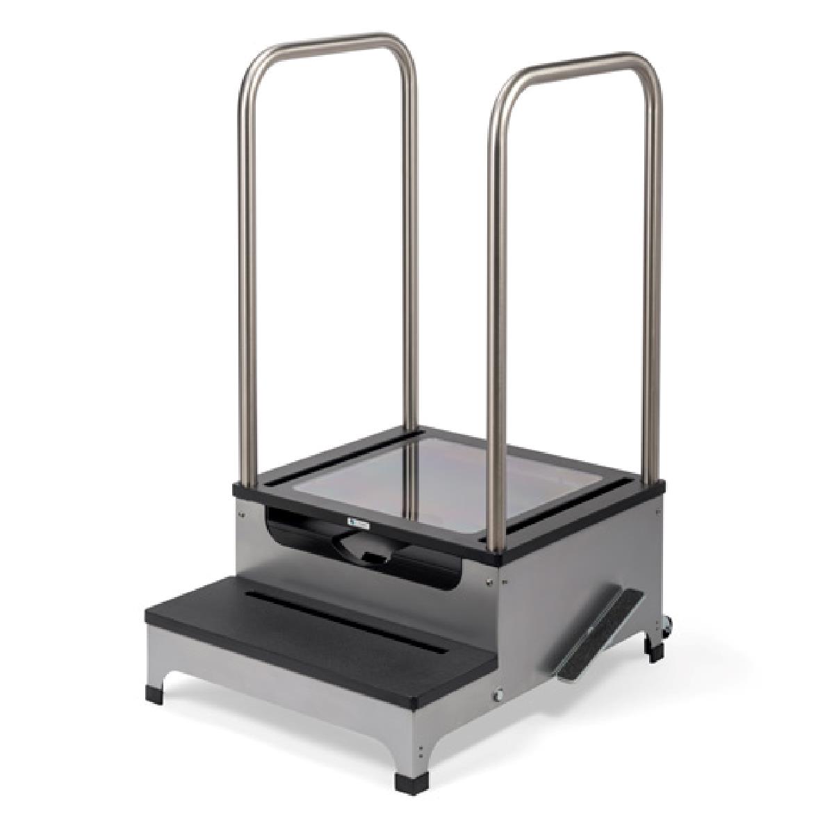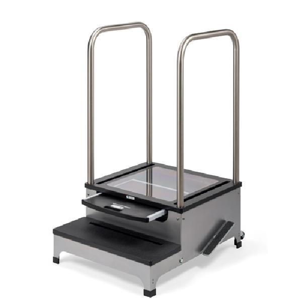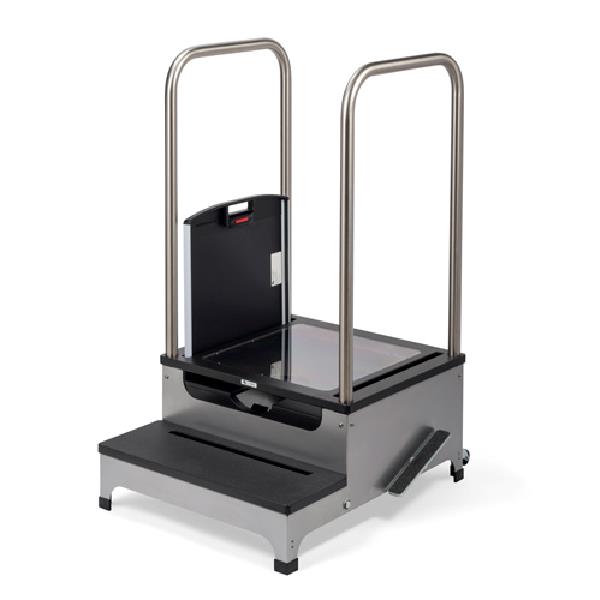 Complete View 2-Step Weight Bearing Platform with Swivel 360 System kombinerer flere funksjoner i samme enhet. Dette gir vektbærende AP- og lateralbilder fra samme pasientposisjon. Complete View 2-Step Platform inkluderer Lock-N-Secure ® 43 x 43 cm uten ekstra kostnad. Stativet har et nytt hjulsystem som gjør det mulig med 360-graders rotasjon og uanstrengt mobilitet. Vekt: 57 kg. Vektbegrensning: 340 kg.