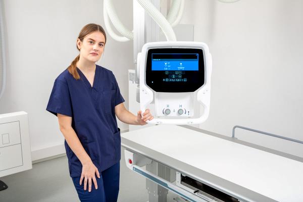 Du betjener røntgensystemet fra en ny stor berøringsskjerm, med bakgrunnsbelysning som skifter farge etter status på røret. Håndtaket til manuell justering fungerer også som en støtte til hendene ved bruk av blendeknappene, og gir en naturlig beskyttelse av displayet. Skjermen inneholder all informasjonen på ett sted. Dette inkluderer bilder fra de siste eksponeringene, justering av eksponeringparametere, røntgenrøret- og veggstativets vinkling, blendestørrelse, SID, mm.