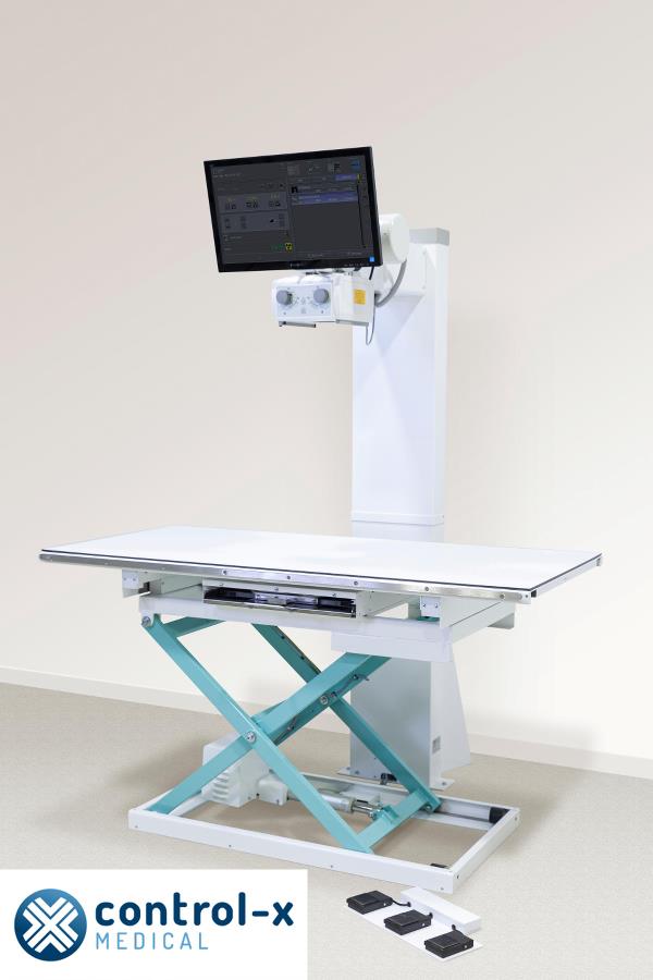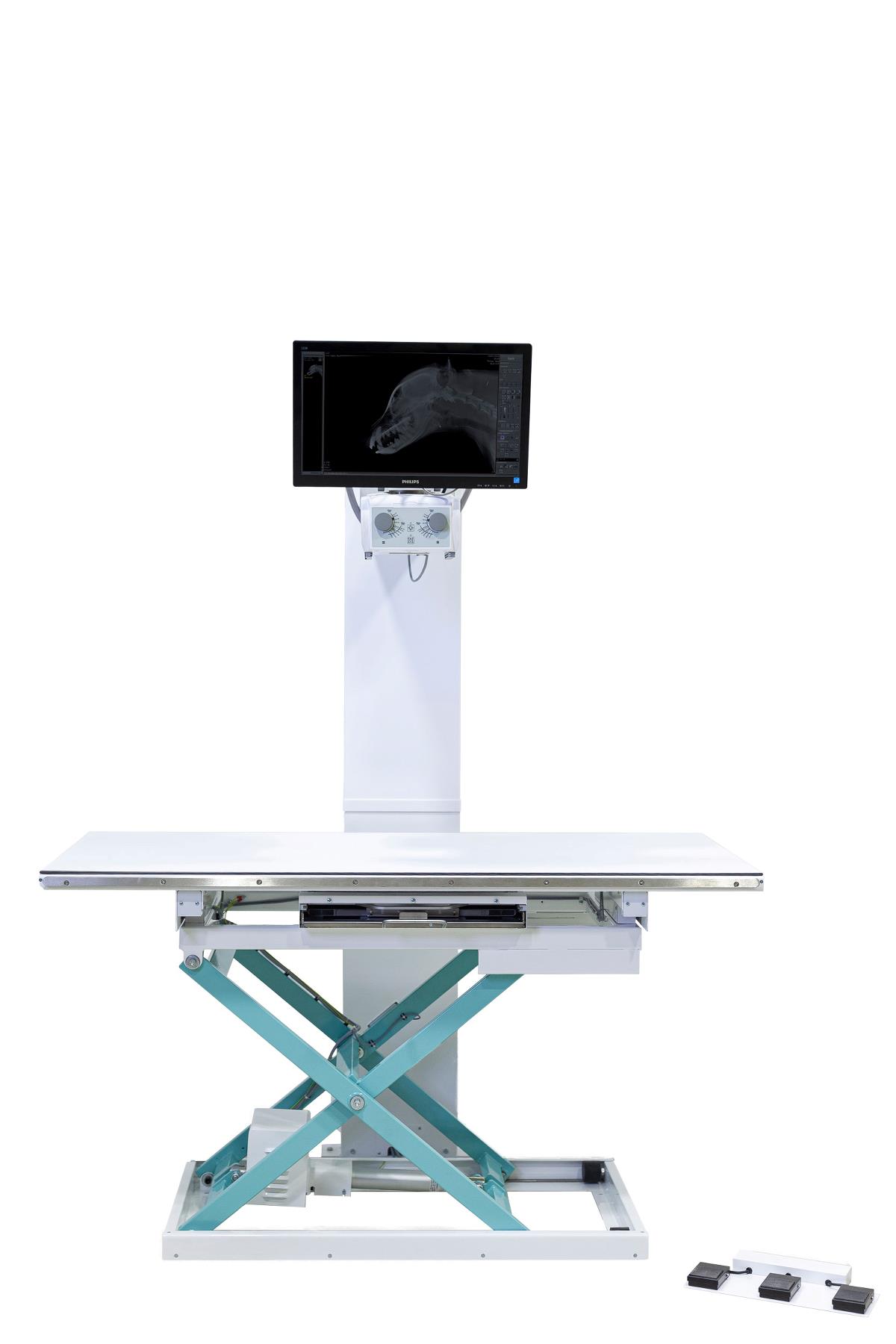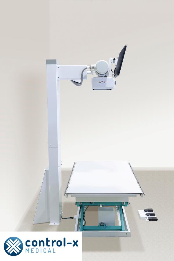 Enkelt og rimelig røntgensystem med gulvmontert røntgenrør og seng.