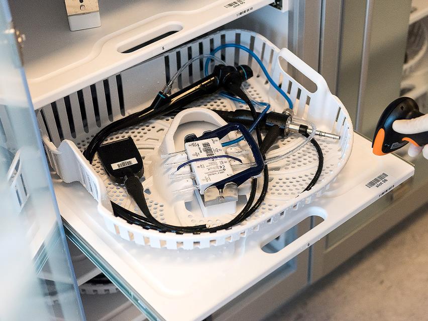 Når vaskeprosessen er ferdig, tas kassetten ut av vaskemaskinen og setter den inn i tørke- og oppbevaringsskapet. Kort sagt skal du ikke røre endoskopet, før det skal i bruk neste gang.